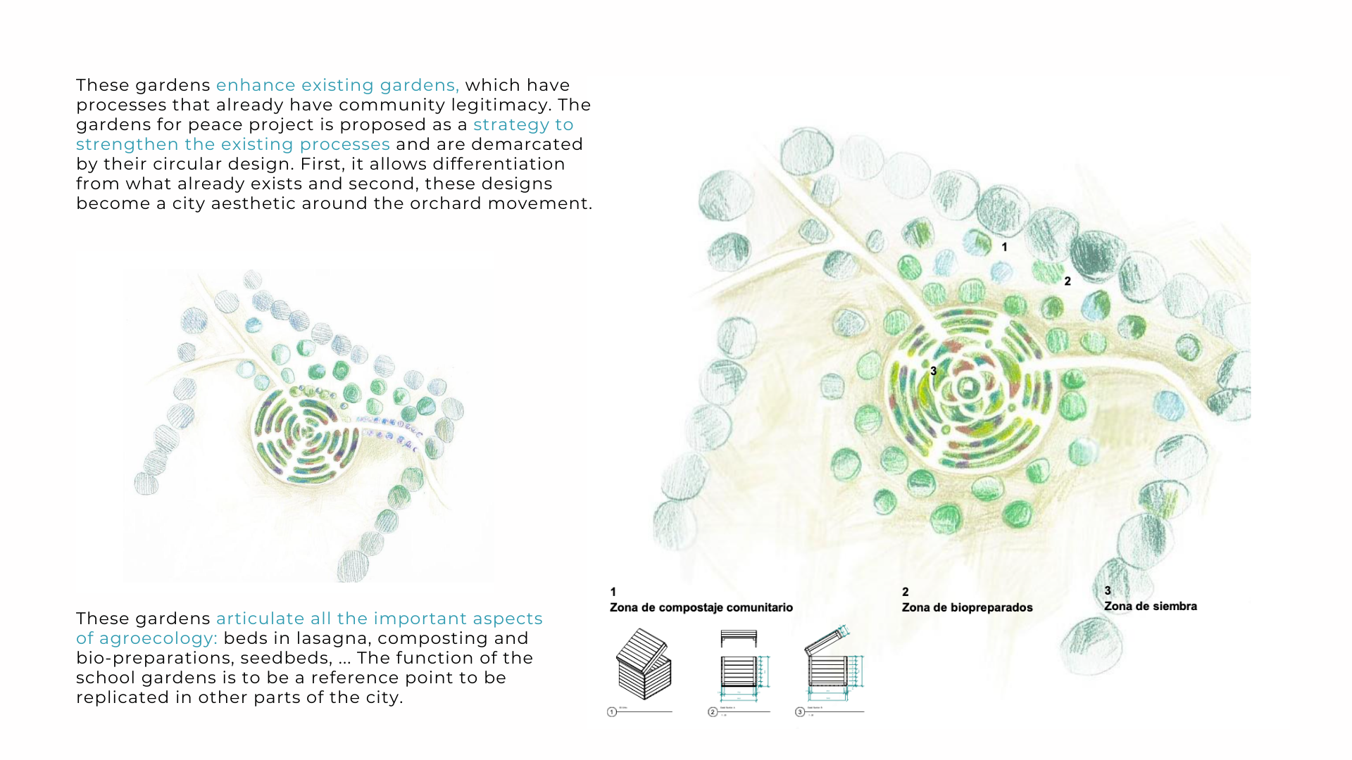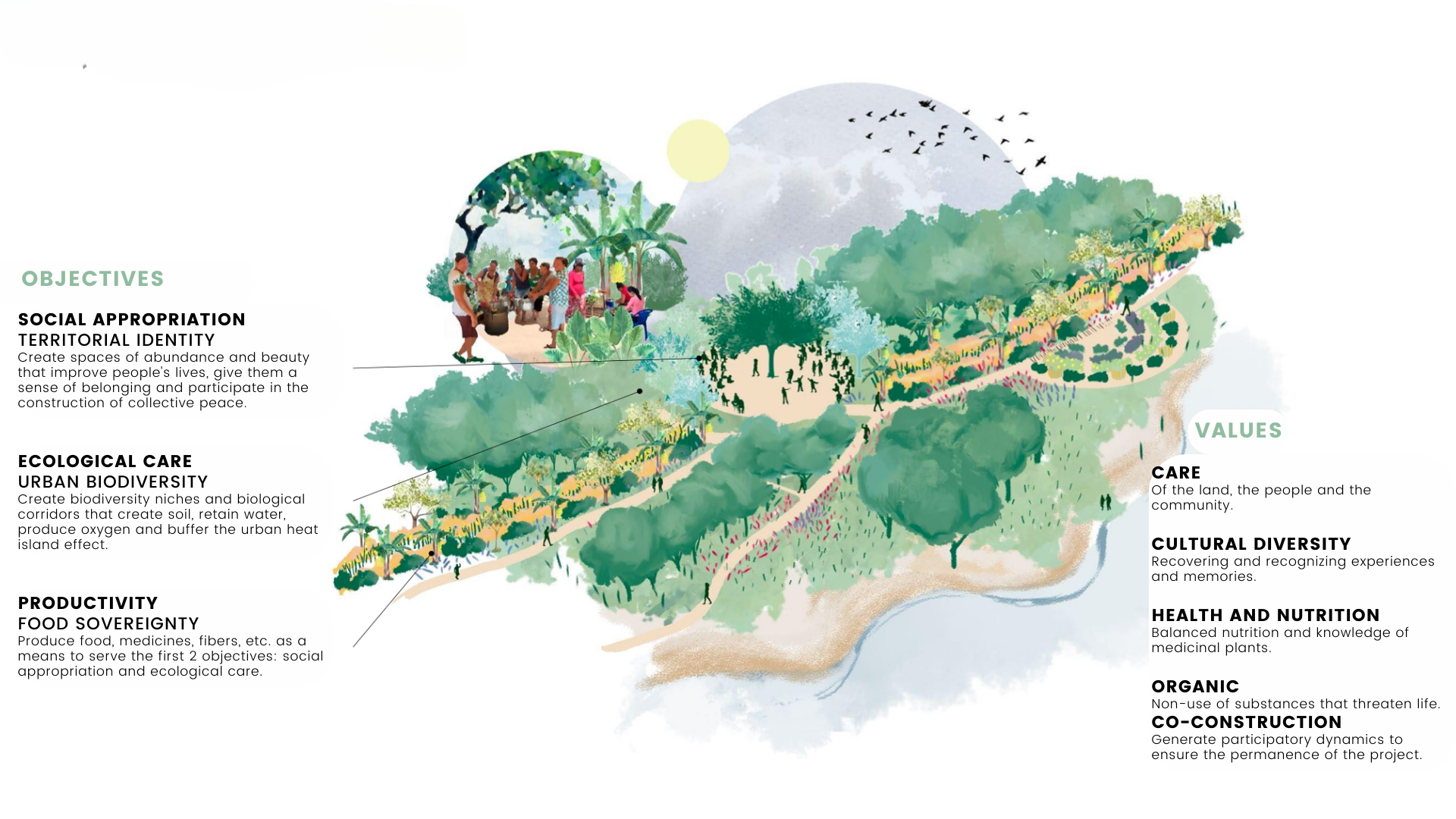 The Peace Gardens are spaces for community gathering and collective memory-building, where each person shares their knowledge and experiences. In these gardens, learning is shared horizontally, honoring both ancestral wisdom and local innovation. They also serve as oases of peace and diversity, valuing each individual equally and fostering peaceful coexistence. These spaces invite everyone to participate in building an inclusive and resilient society, where memory, shared learning, and peace are essential pillars.